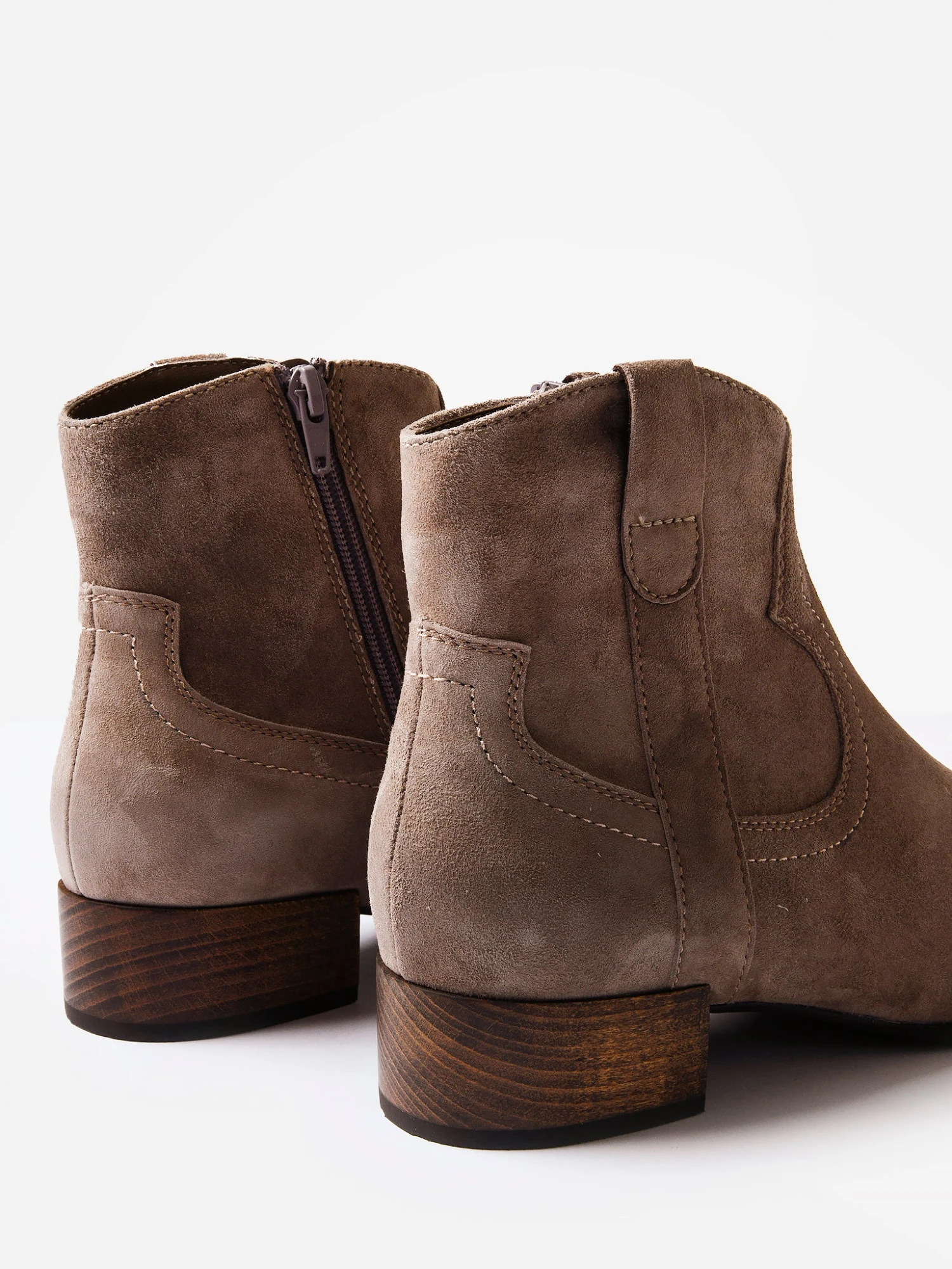 Suede western ankle boot with a stacked heel.