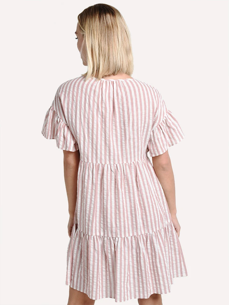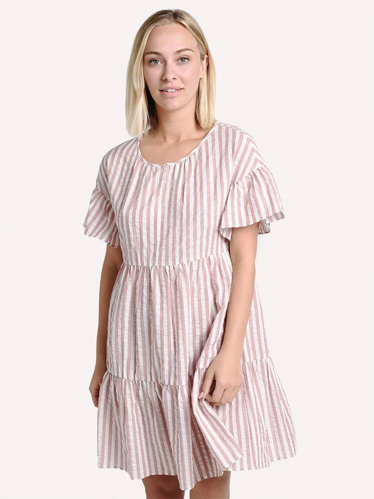 FEATURES:Stripe DressLightweightRound NecklineRuffle SleeveTiered Flounce Skirt70% Cotton, 30% ViscoseMade in USAStyled with soludos sandals Style # 1000341. Model is wearing size Small dress.