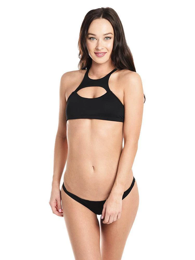 FEATURES:High round neckline over cutout bodice.Lightly padded cups provide support and shape.X-back straps tie at middle back.83% recycled nylon, 17% Xtra Life Lycra spandex.Hand wash, dry flat.Made in the U.S.A. and Imported.Styled with Vitamin A Bottom Style # 167BF. Model is wearing size small top and bottom.