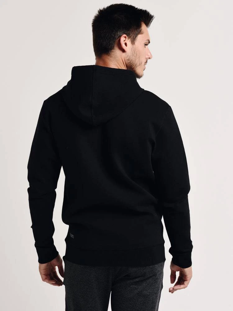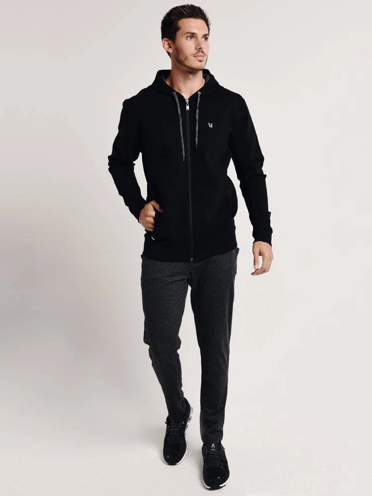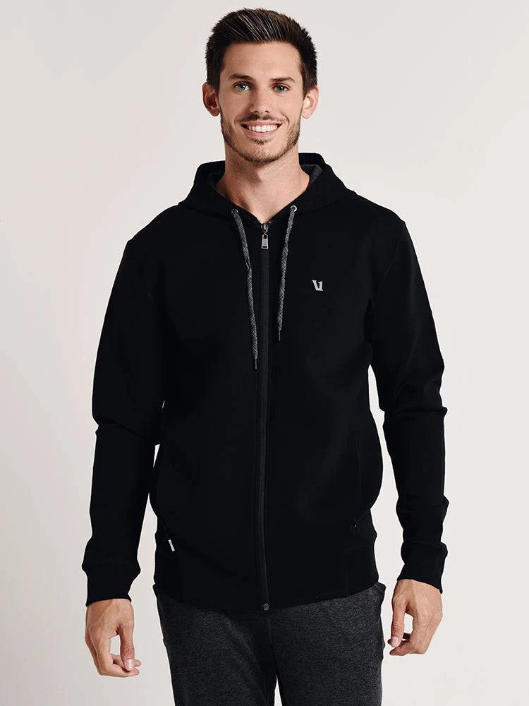FEATURES:Full front zip Hood with drawstring Logo on chest Front pockets Moisture-wicking 4-way stretch 88% cotton, 8% nylon, 6% spandex Styled with Vuori pant Style # V418 and On shoes Style # MENS CLOUD NEW. Model is wearing size large jacket and pant.