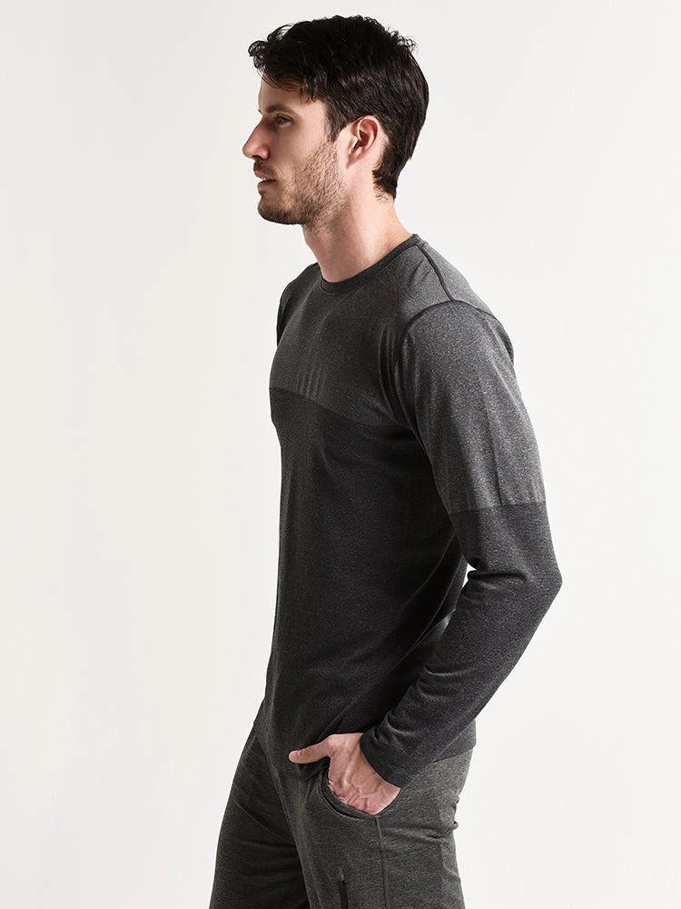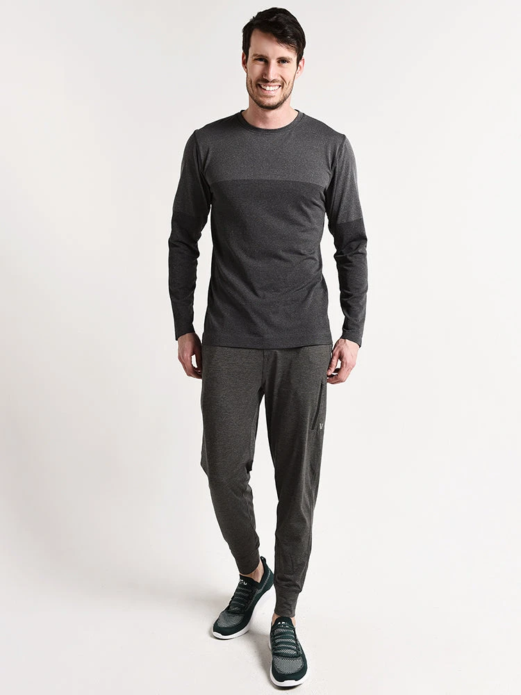 FEATURES:Crew neck Long sleeve Flatlock seams Moisture-wicking Quick-drying 89% polyester, 11% elastane Styled with Vuori pant Style # V416 and APL sneakers Style # 1-2-007-318-302. Model is wearing size medium shirt and pant.