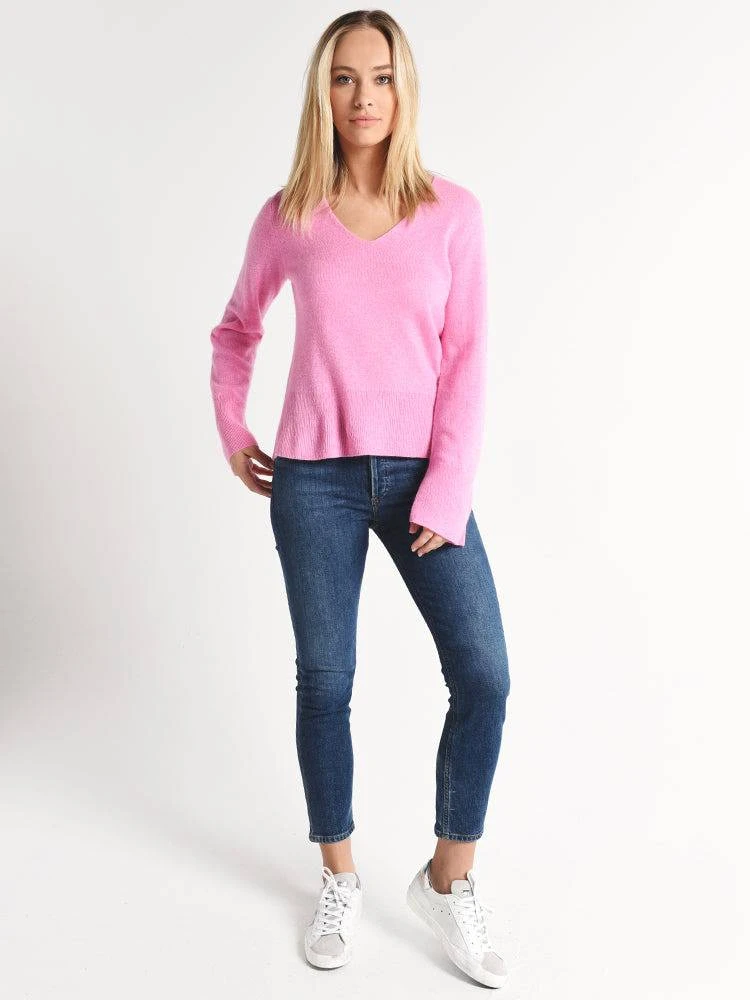 FEATURES:V-neck Long sleeve with bell and slit detail at cuff Slightly relaxed fit Hip length (23 inch in length based on size small)100% cashmere Hand wash or dry clean Styled with Agolde jeans Style # A093C-1046 and Philippe Model sneakers Style # CLLD 1005. Model is wearing size small sweater and size 26 jean.
