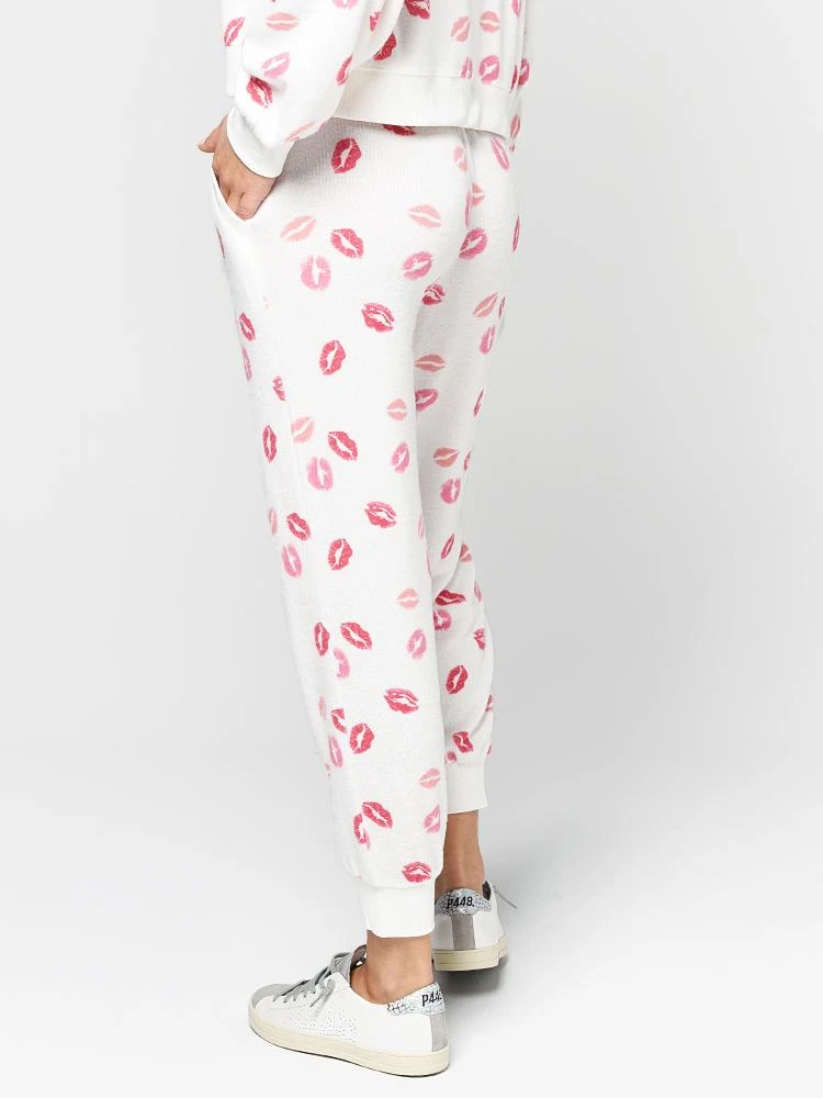 FEATURES:Lounge PantElasticized Waistband with DrawstringAll-Over kisses PrintJogger StyleSuper SoftBrushed Sweater Knit FabricationRibbed Waistband and HemTapered SilhouetteRelaxed Fit62% Polyester, 33% Rayon, 5% Spandex