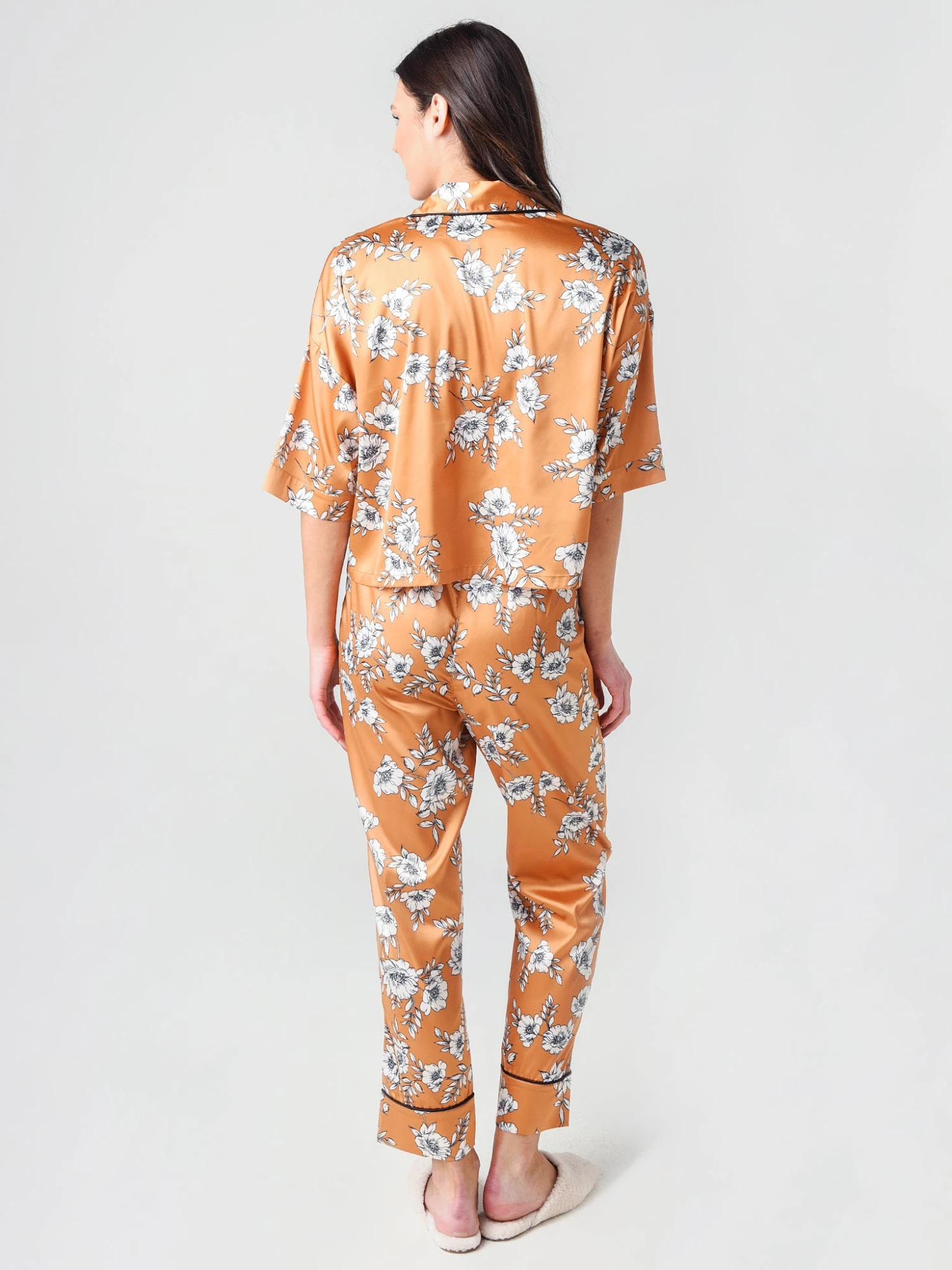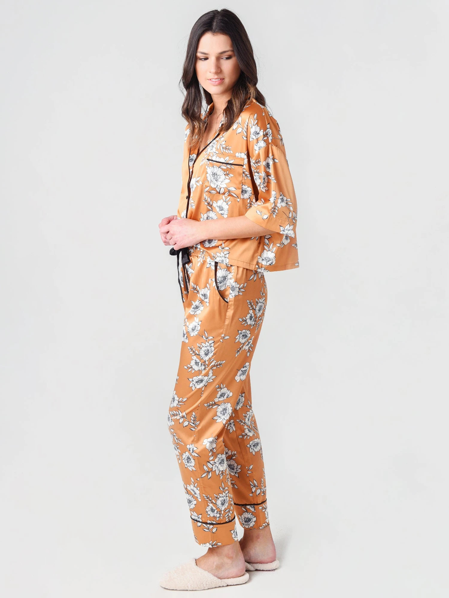 FEATURES:Pajama/Lounge SetButton-Down TopLapel DetailContrast PipingLeft Chest Slit PocketElasticized Waistband with Ribbon TieAll-Over Floral PrintSatin FeelRelaxed Fit96% Polyester, 4% SpandexModel is wearing size Small pajamas.Model’s Measurements: Height: 5’9.5″; Bust: 34A; Waist: 26.5″; Hips: 37″; Dress Size: 2-4 (US)