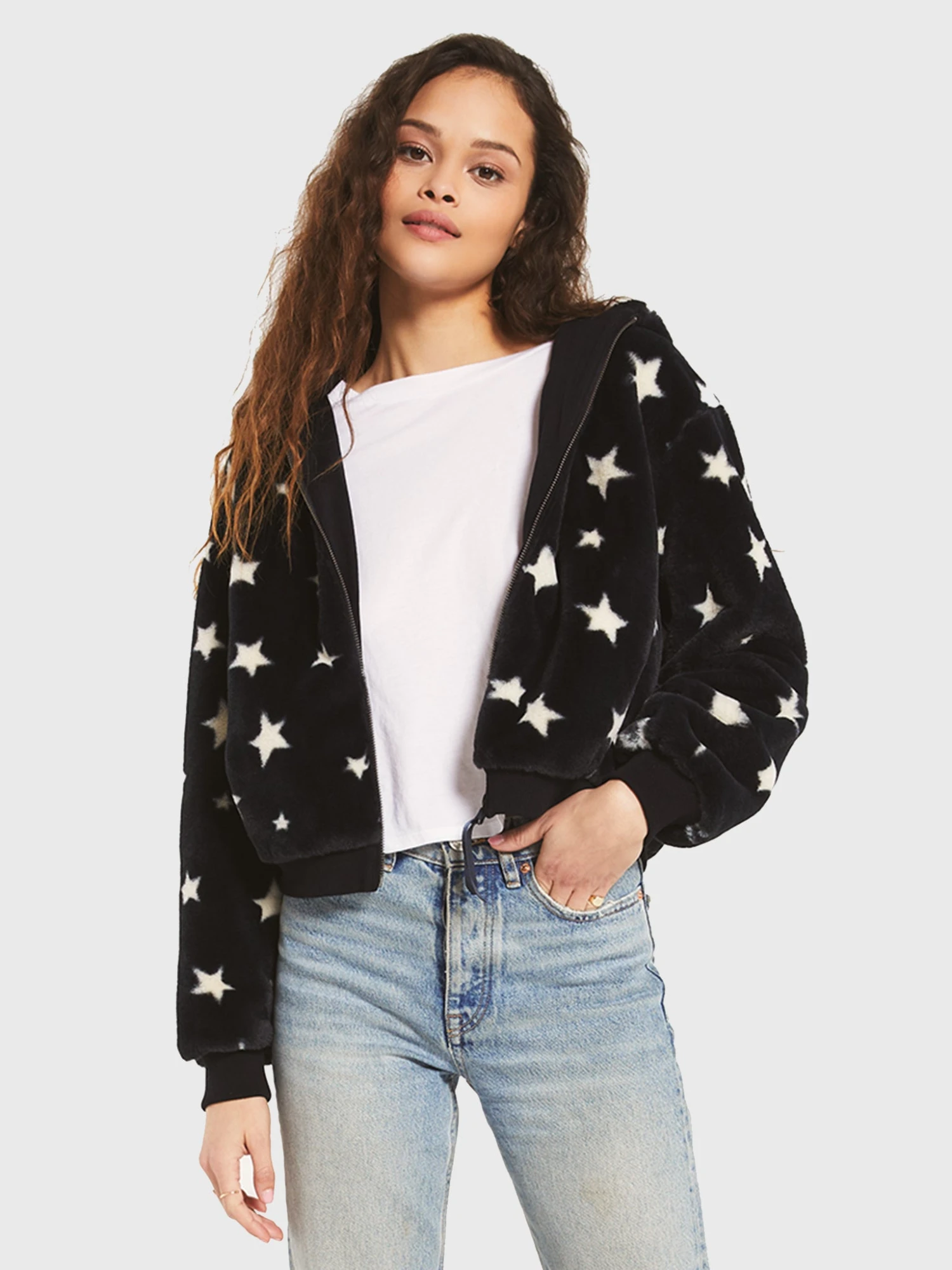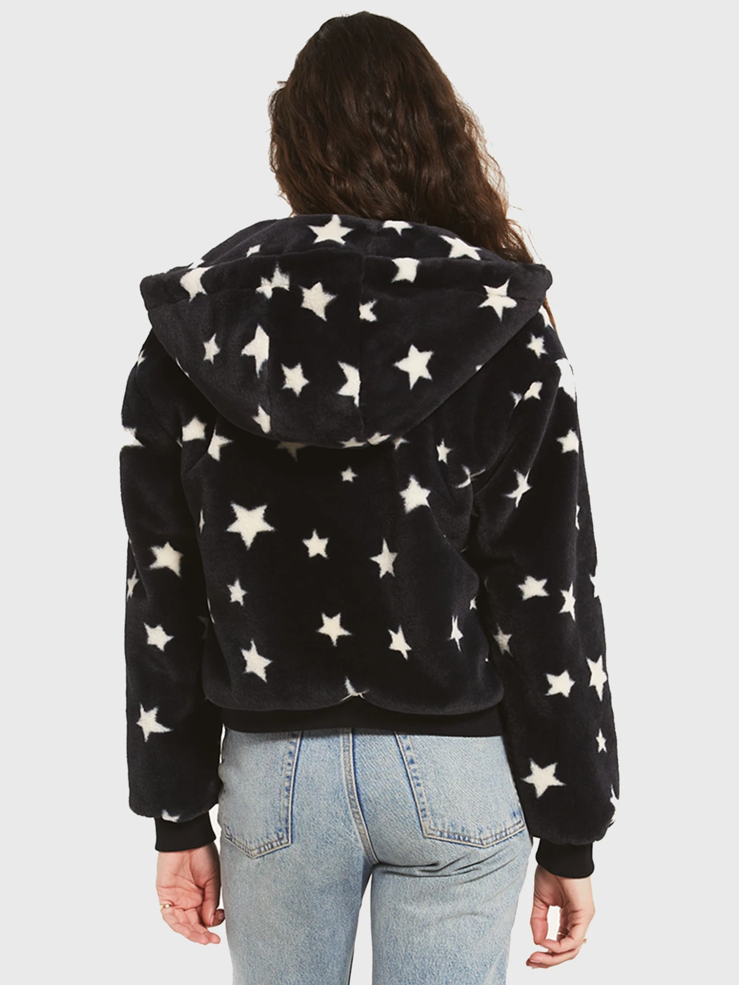 FEATURES:Bomber JacketHoodedFull-Zip ClosureAll-Over Star MotifFaux-Fur, FleeceRibbed Cuffs and HemSuper Soft and CozyPolyester