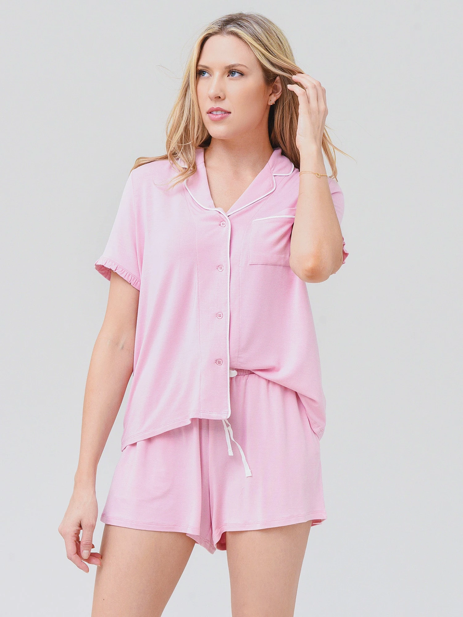FEATURES:Pajama SetPJ TopNotched LapelButton-Down PlacketShort Sleeve with Ruffle TrimLeft Chest Pocket Matching Bottom ShortsPocketsElastic Waistband with an Adjustable Drawstring96% Modal, 4% Spandex JerseyModel is wearing size Small pajama set.Model’s Measurements: Height: 5’9″ | Bust: 34C | Waist: 25″ | Hips: 35.5″ | Dress Size: 4 (US)