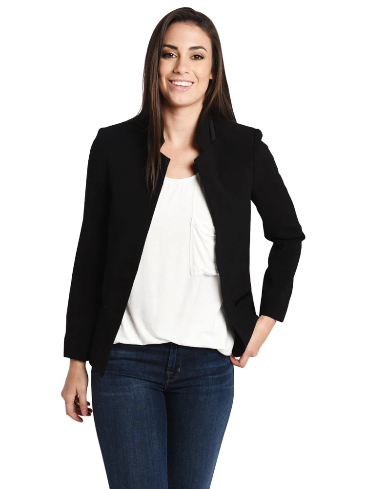 FEATURES:Open front High notched lapels Stitched satin detail at collar Piped trim pockets Split hem at back 100% viscose 76% acetate, 21% viscose, 35 elastane Dry clean Styled with Ellison top Style # RT-1728-6, J Brand jeans Style # 811O208 and Schutz shoes Style # TAE. Model is wearing size 34 blazer, size small top and size 26 jean.
